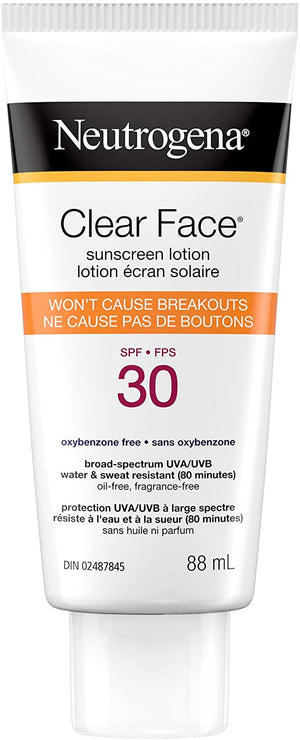 Neutrogena Sunscreen Lotion Clear Face for Acne Prone Skin, SPF 30, Water Resistant, Non Comedogenic & won't cause breakouts, 88 mL