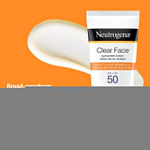 Neutrogena Clear face sunscreen lotion with broad spectrum SPF 30 offers UVA and UVB sun protection. For face and body, This lightweight sunscreen lotion helps prevent sunburn without causing breakouts on acne-prone skin. The liquid-lotion has a water-light texture that leaves a weightless, matte finish so skin can breathe. Featuring an oxybenzone-free formula, the facial sunscreen offers effective broad spectrum protection from skin-aging UVA and skin-burning UVB rays. This dermatologist-tested formula is fragrance free and non-comedogenic, so it won't clog pores or cause breakouts. It is water-resistant up to 80 minutes.