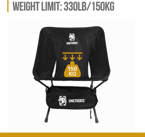 - OneTigris backpacking chair is made of 7075 aluminum alloy frame and heavy duty 600D polyester of durability and dirt/water/scratch resistance; Weighs only 2.4lb (1.1kg), up to 330.6lb (150kg) weight capacity.