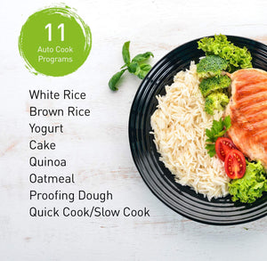 - Select from 8 automatic menu options for a variety of rice, hot cereals, soups, yogurt, quinoa and more on an easy-to-use display and touch buttons