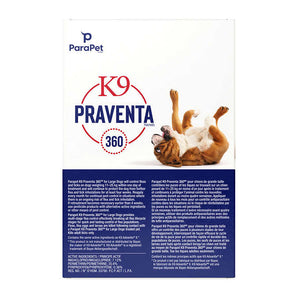 K9 Praventa 360 provides multi-stage flea control, breaking all flea life cycle stages for quick and lasting control of flea populations. Fleas, flea eggs and larvae are killed following contact with a pet treated with K9 Praventa 360.