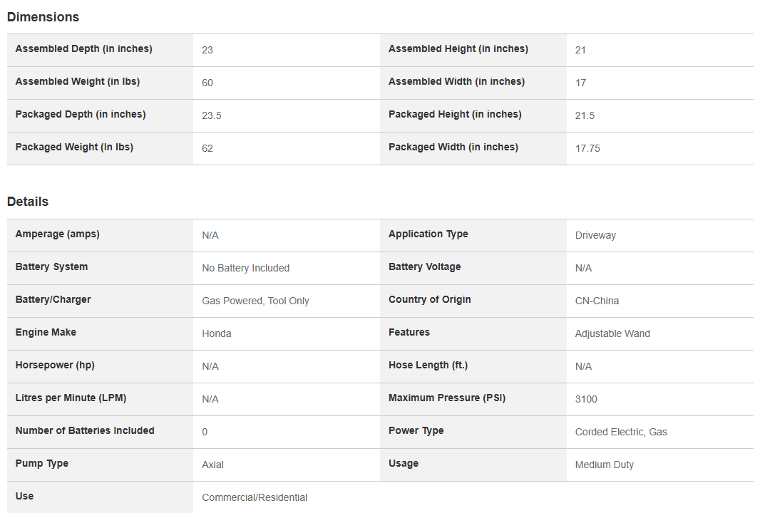 The RYOBI 3100 PSI Pressure Washer is engineered to handle even your toughest jobs. With a powerful Honda GCV170 167cc premium gasoline engine, for easy, reliable starting. This RYOBI Pressure Washer delivers 3100 PSI of force for quick cleaning of driveways, decks, windows and other areas around the house. Featuring a durable, compact frame design and large 12 in. flat-free wheels this pressure washer is designed for easy transport. The 35 ft. non-marring high pressure hose provides 40% longer reach for access to even the toughest areas. The on-board detergent tank offers hassle-free cleaning by eliminating the need to drag a bucket and hose behind you. For added convenience, the RYOBI 3100 PSI Pressure Washer is equipped a 5-in-1 quick-change-over nozzle for versatile cleaning. This pressure washer is backed with the RYOBI 3-year limited warranty and is guaranteed to deliver results for years to come.