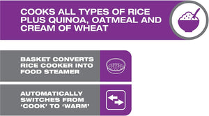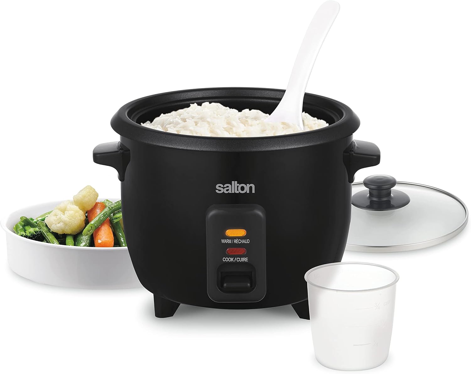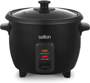 Salton 6-Cup Automatic Rice Cooker | Bonus Food Steaming Basket | Keep Warm Function | Ideal for Rice, Quinoa, and Oatmeal | 300W | Includes Non-Stick Rice Bowl, Measuring Cup & Spatula | Black