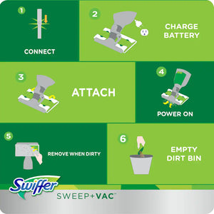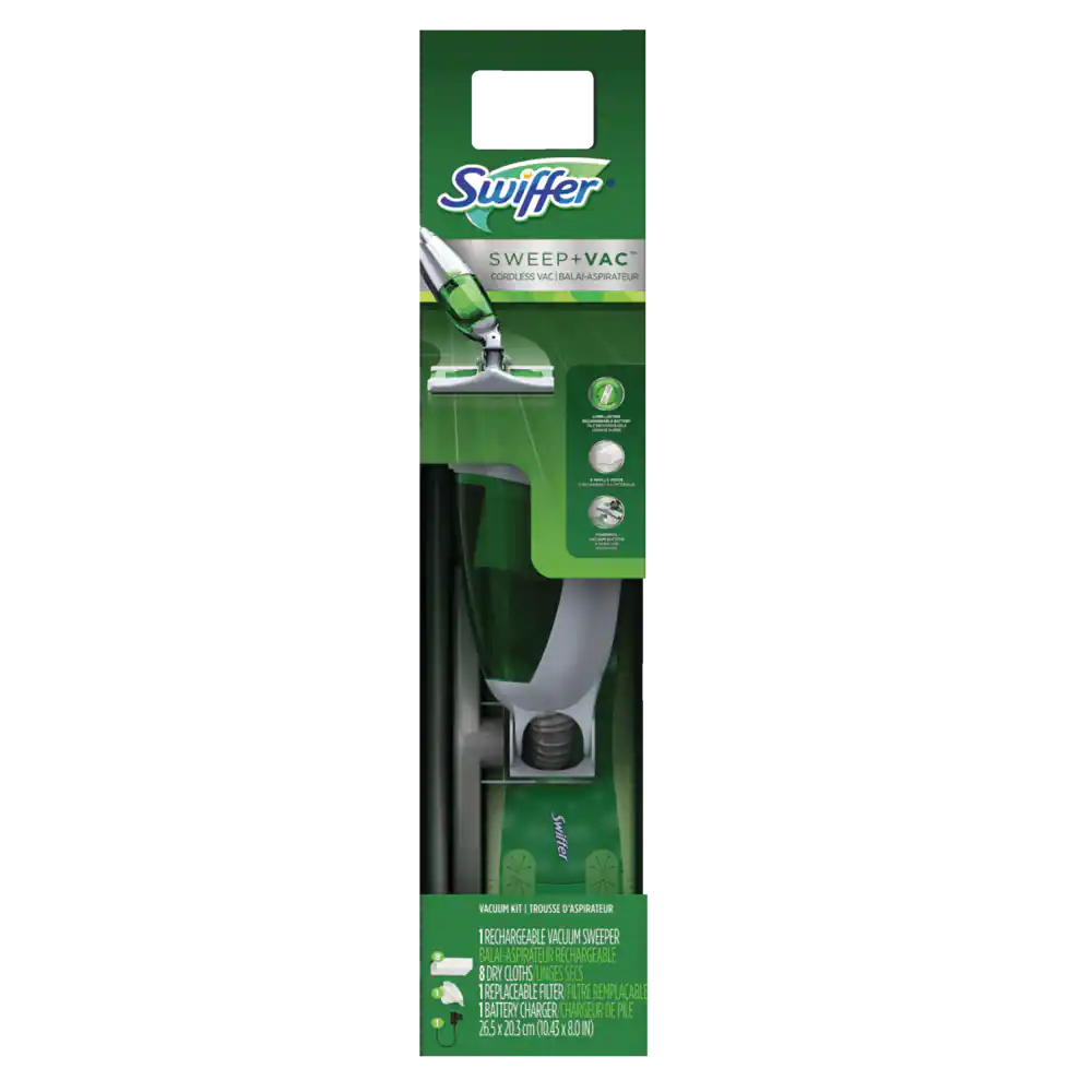 - Swiffer Sweep + Vac is a rechargeable, cordless sweeping system designed to clean dirt, dust and hair using a thick Swiffer Sweeper dry sweeping cloth to dig deep and pick up dirt from textured grout lines and then its powerful vacuum grabs larger particles like crumbs