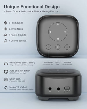 - This Sound Machine with 5 White Noise (Brown /Pink /White Noise etc.), 5 Fan Sounds (Box Fan /Industrial Fan etc.), 7 Nature Sounds (Rain /Thunderstorm /Brook /Ocean etc.), 7 Unique Sounds (Lullaby /Heartbeat/Piano etc.)