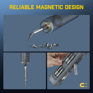 - Magnetic Storage Case: Includes a sleek magnetic aluminum alloy case to keep the electric screwdriver and 14 metal bits neatly organized. Features a pop-up mechanism for smooth opening and closing, plus magnetic chuck and bits for easy attachment.