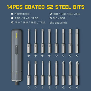 - What’s Included: 1x Electric Screwdriver, 1x Storage Case, 14x Precision Bits, USB Type-C Charging Cable, 1x User Manual. Everything you need for efficient repairs and assembly!What’s Included: 1x Electric Screwdriver, 1x Storage Case, 14x Precision Bits, USB Type-C Charging Cable, 1x User Manual. Everything you need for efficient repairs and assembly!