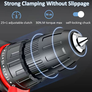 - 【25+1 Adjustable Clutch, 2-Variable Speed and 25N.M Torque】The cordless drill has 25 different torque settings and drilling functions. High and low double speed. Maximum torque 25N.M for screws. It can be used to drill wood, metal, plastic and all the activities of a screwdriver