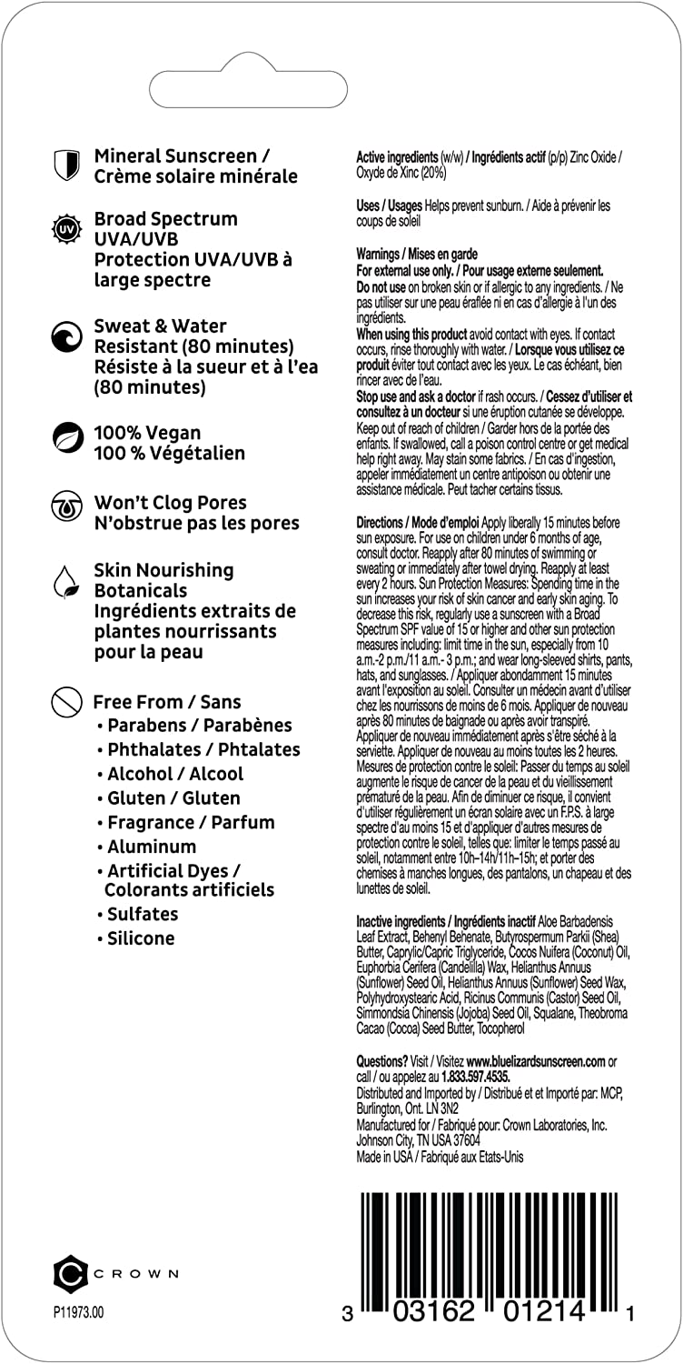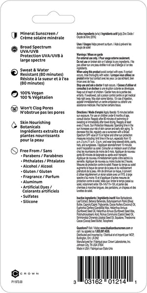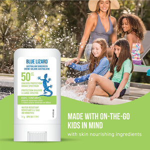 Protect little faces without the fuss. Blue Lizard’s mineral Kids Sunscreen Stick offers broad spectrum UVA/UVB SPF 50+ protection in an easy-to-carry and easy-to-apply formula. This non-tinted, non-comedogenic solid sunscreen glides on easily, rubs in clear and dries smooth, not sticky. This sweat resistant and water resistant goes on easily and stays on for up to 80 minutes in the water. Made with aloe vera, shea butter, sunflower seed oil and vitamin E to naturally nourish your little one’s skin while the mineral Zinc Oxide keeps it protected from the sun’s rays. 100% vegan with no parabens, no fragrances and no chemical active ingredients – this sunscreen is ideal for sensitive skin.
