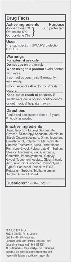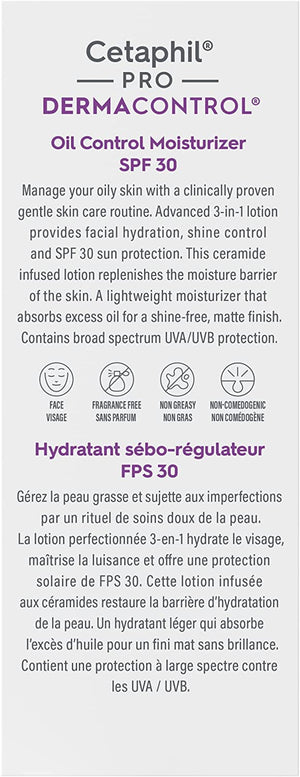 Cetaphil DERMACONTROL Oil Control Moisturizer SPF 30 Advanced 3-in-1 lotion provides facial hydration, shine control and SPF 30 sun protection. This ceramide infused lotion replenishes the moisture barrier of the skin and contains Zinc Gluconate to absorb excess oil for a shine-free, matte finish appearance. Lightweight, absorbs quickly with long-lasting hydration and provides broad spectrum UVA/UVB protection. Non-comedogenic and non-greasy.