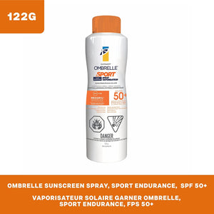 Garnier Ombrelle Sport Spray Sunscreen SPF 50+, Sweat + Water resistant, Ultra-Lightweight texture, Hypoallergenic aerosol, Fragrance Free, 122g