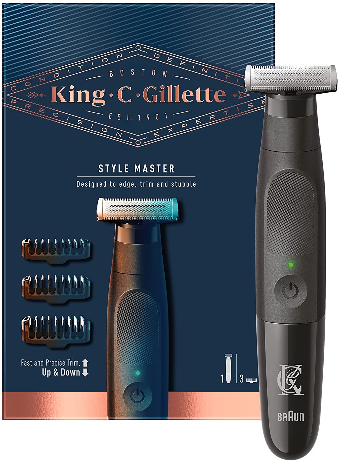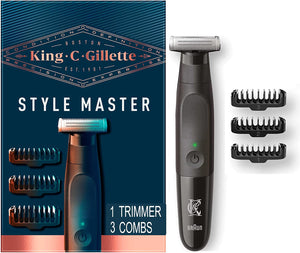 Gillette is a complete line of precision grooming tools and quality facial hair care products. This range is the pinnacle of over a century’s worth of innovation and expertise, and the only range that bears the name of our company’s founder: King C. Gillette. It gives you everything you need to craft, maintain, and master your style - no matter how you wear your facial hair. The King C. Gillette Style Master is a versatile tool designed to edge, trim and stubble. This cordless trimmer has 4D Blades that trim both long and short hairs for easy, fast, comfortable strokes while shaving. The Style Master’s 3 interchangeable comb attachments (1mm, 3mm, or 5mm) allow for shaving strokes in up, down, or side-to-side directions for freedom and flexibility while shaving. It also features a replaceable full metal blade that’s good for up to 6 months of close shaves, a pivoting contour head for hard to reach areas and a slim 360˚ rubberized grip for max precision. And it’s fully waterproof with a 45 minute battery life for convenient in-shower use. The perfect tool to discover new styles and master every one.