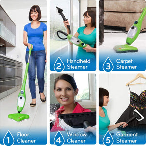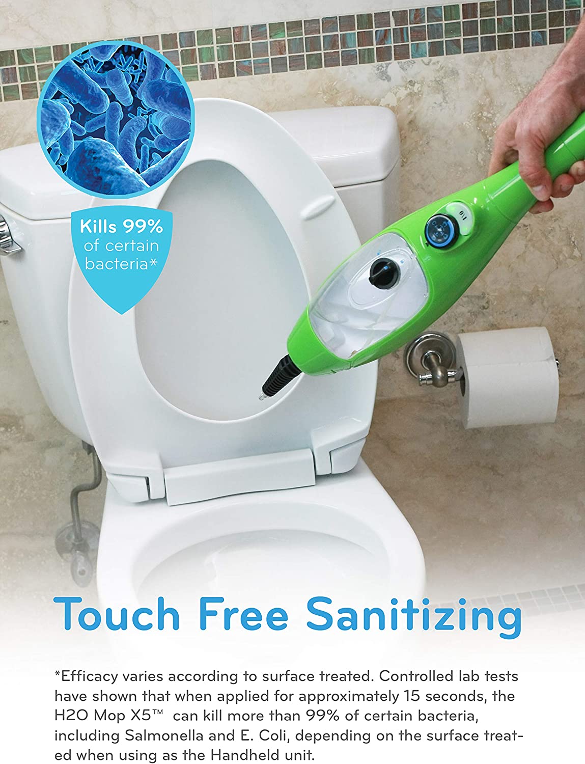 The H2O Mop X5 Basic Kit includes the H20 Mop X5 steamer, 1 stainless steel limescale cleaning pin, 1 measuring cup, 1 glider, 1 white microfiber cloth pad, 1 nozzle, 1 33.5 inch extension hose, 1 window cleaning tool with squeegee, 1 microfiber garment cleaning cloth, 1 duster, 1 coral cloth for the duster, 1 round metal brush head all included in this portable handheld steam cleaner.