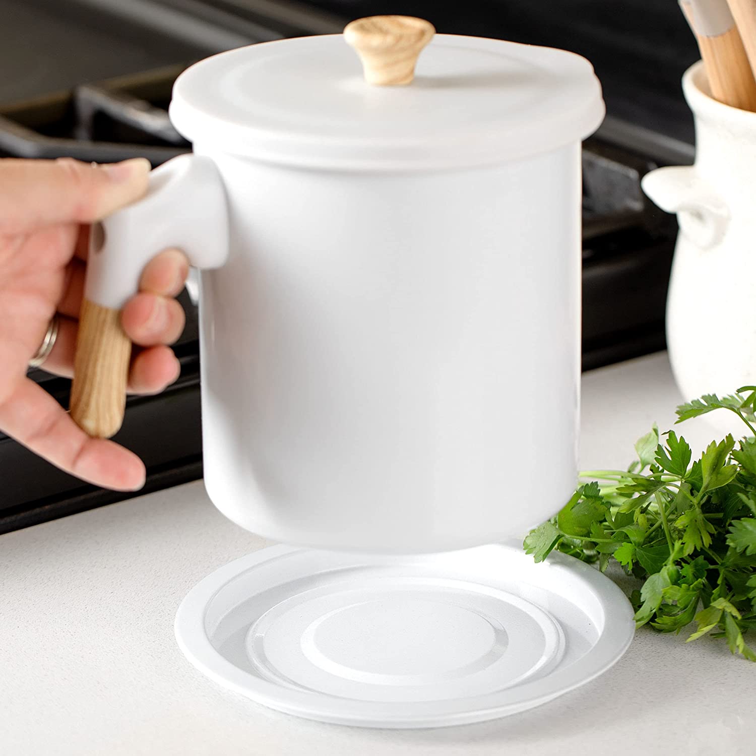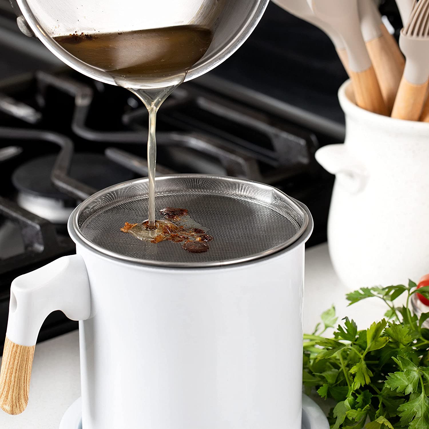 •  Our farmhouse decor style non-stick bacon grease container is made from food-grade iron with a stainless steel strainer; It also features a durable handle to easily pour the oil or grease