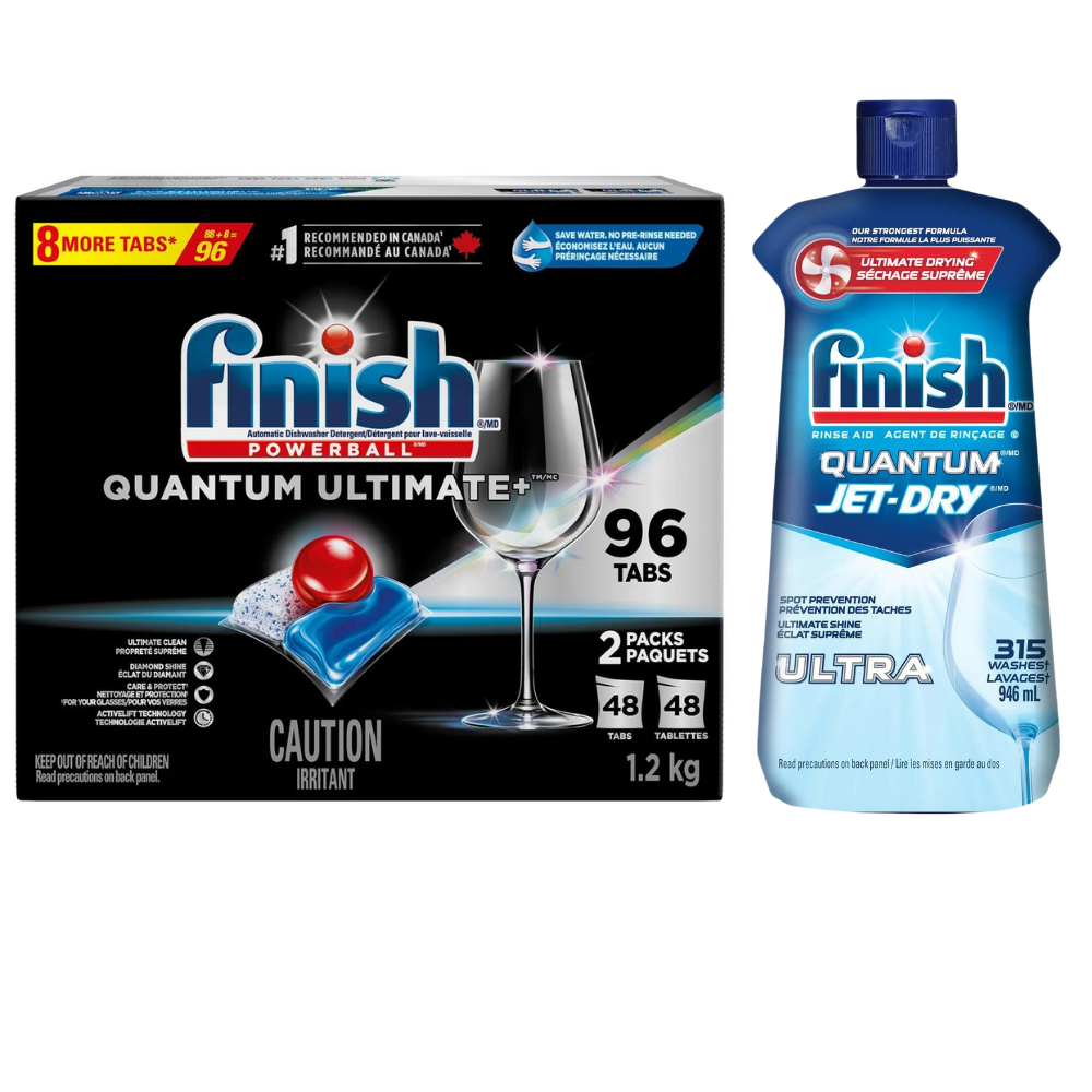 Dishes coming out wet or spotty? Experience drier and shinier dishes (vs. dishwasher detergent alone) with Finish® Jet Dry® Quantum® Ultra rinse aid. It contains more surfactants which turn water droplets into a thin, quick-to-evaporate layer to deliver 40% better drying* (vs. our previous formula). It works with your dishwashing detergent to prevent spots and film and delivers sparkling dishes, glasses, utensils and even plastics.
