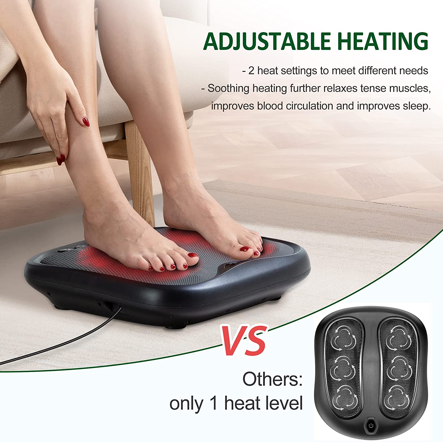 - Therapeutic heat - Snailax foot massager with 2 optional heating levels provides perfect heated foot warmer to ease tired foot muscles. The heat massage alleviate body fatigue and promote better sleep.