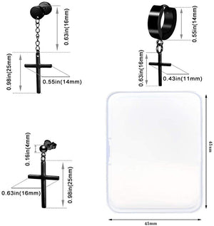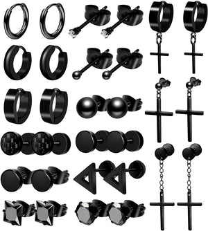 - PACKAGE INCLUDE 15 pairs mens earrings come with a box. 3 pairs dangle hoop earrings, 3 pairs circle earring hoops, 9 pairs different shapes black stud earrings . More earing styles meet your need.