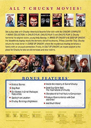Set a play date with Chucky—America's favorite killer doll—with the Chucky: Complete 7-Movie Collection. In Child's Play, Child's Play 2 and Child's Play 3, Chucky torments his original victim, young Andy Barclay. In Bride of Chucky and Seed of Chucky, the bloodthirsty boy-toy meets his demonic doll of his dreams, Tiffany (Jennifer Tilly). Chucky returns for more terror in Curse of Chucky, where the murderous mop-top terrorizes a family with an unusual connection. Finally, in Cult of Chucky, an insane asylum is the place for Chucky to take on old nemeses and new victims.