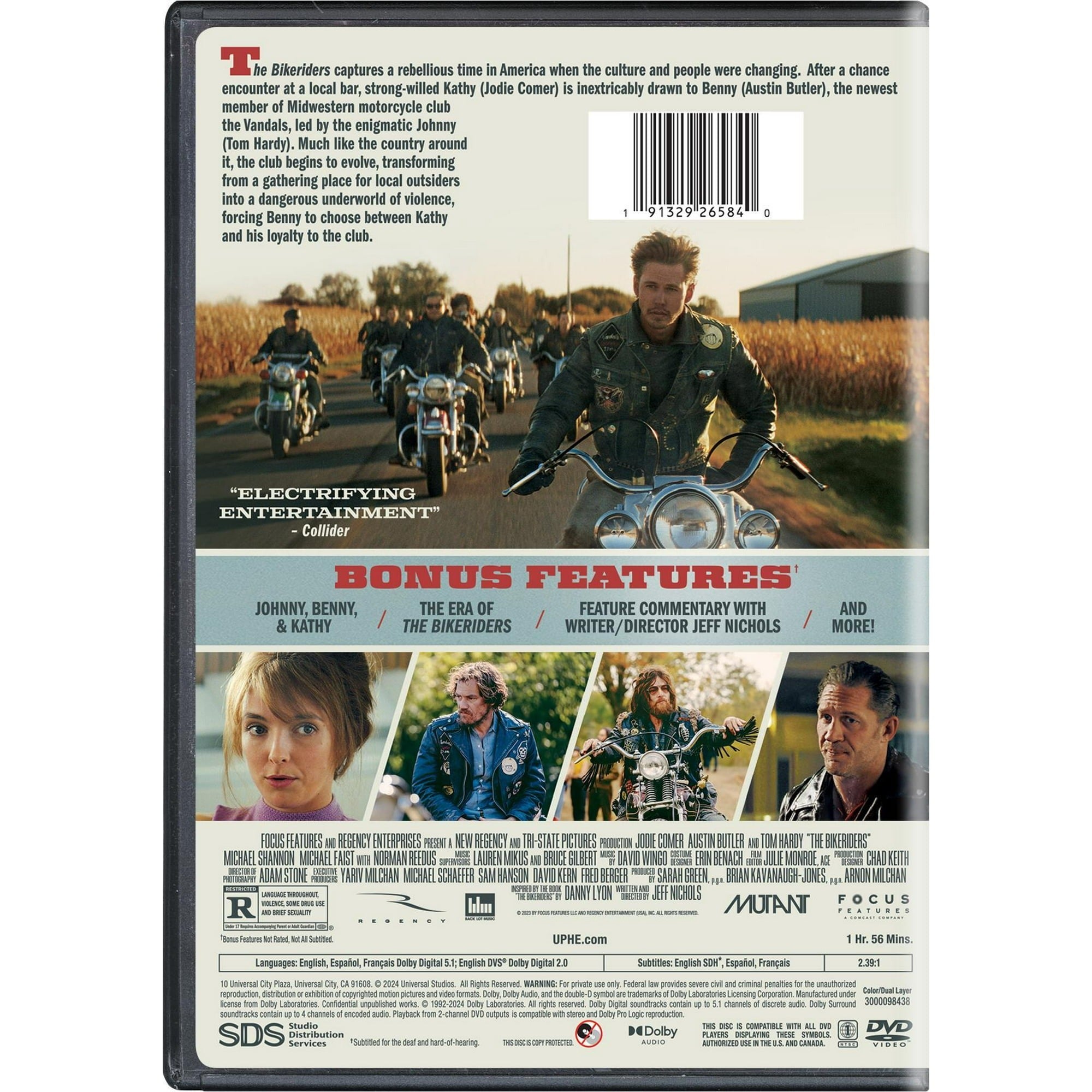 The Bikeriders captures a rebellious time in America when the culture and people were changing. After a chance encounter at a local bar, strong-willed Kathy (Jodie Comer) is inextricably drawn to Benny (Austin Butler), the newest member of Midwestern motorcycle club, the Vandals led by the enigmatic Johnny (Tom Hardy). Much like the country around it, the club begins to evolve, transforming from a gathering place for local outsiders into a dangerous underworld of violence, forcing Benny to choose between Kathy and his loyalty to the club.
