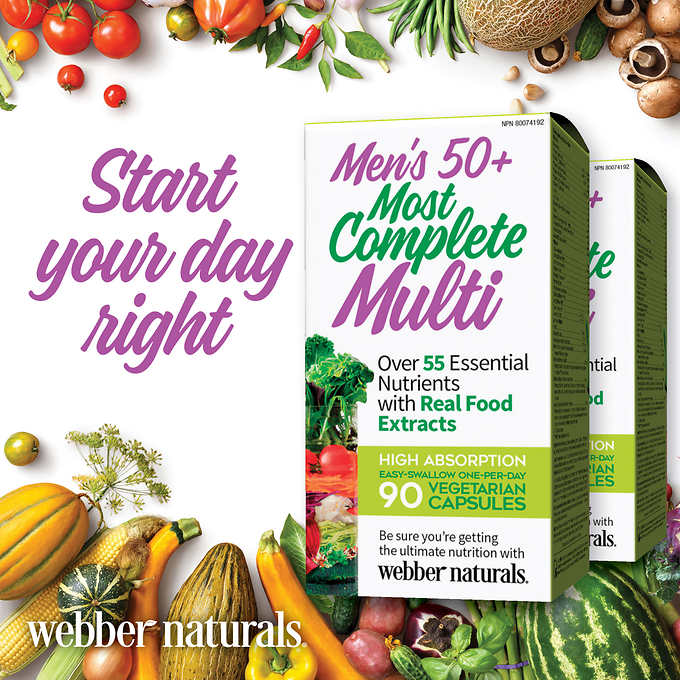 Men’s 50+ Most Complete Multi from Webber Naturals provides 100% of the recommended dietary allowance (RDA) for many of the vitamins and minerals needed to support bone health, maintain proper muscle and immune function, and more, for men over 50. Each one-per-day capsule contains bioavailable forms of important nutrients, including vitamin K2 and chelated minerals, in a wholesome base of three superfood groups: fruit, cruciferous vegetables, and a juice concentrate.
