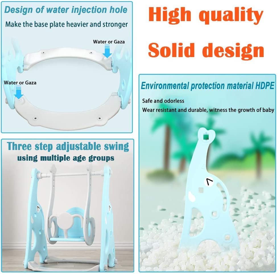 - Widened seats with T-shaped forward leaning protection.Three level adjustable height swing, suitable for multiple age groups, accompany children to grow up happily.Water injection design makes swing close to the ground more stable and not easy to roll allow babies to swing back and forth safely and freely.