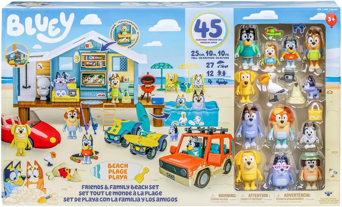 Bluey Bluey and Friends. Ultimate Mega Large Beach trip set. - 45 pieces Includes: (1) Beach Cabin; (4) Vehicles; (12) Figures; (1) Sticker Sheet; (27) Accessories; Includes: (1) Beach Cabin; (4) Vehicles; (12) Figures; (1) Sticker Sheet; (27) Accessories;