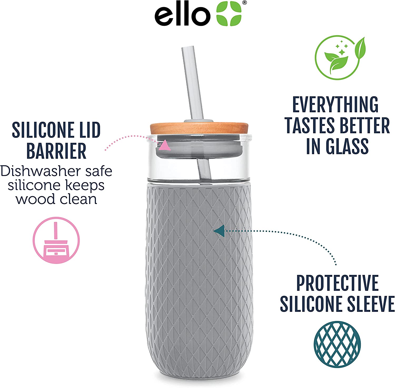 Ello Devon Glass Tumbler with Protective No Sweat Silicone Sleeve and Splash Proof Wooden Detail Lid with Straw, 18 oz