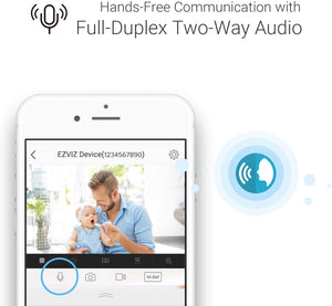 - Simply tap the microphone function in the EZVIZ app to activate simultaneous audio transmission to listen and speak as if you are in the same room.