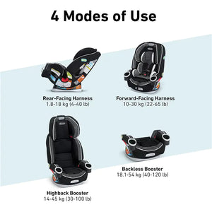 4-in-1 car seat gives you 10 years of use, seamlessly transforms from rear-facing harness 18-18 killogram (4-40 lb) to forward facing harness 10-30 killogram (22-65 lb) to highback booster 18-45 killogram (40-100 lb) to backless booster 18-54 killogram (40-120 lb)