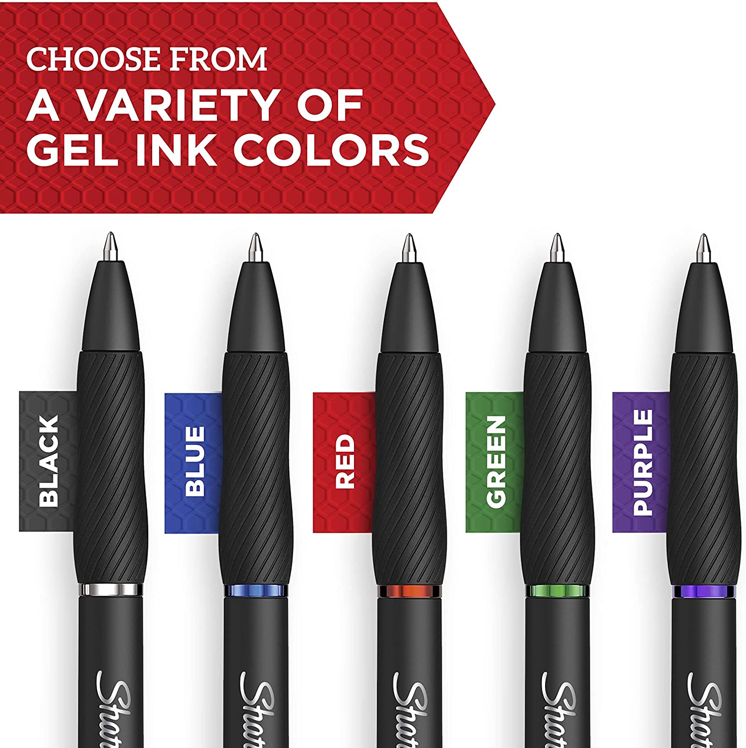 - Includes 4 black, 1 blue, 1 red, 1 green, and 1 purple gel ink pens