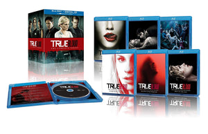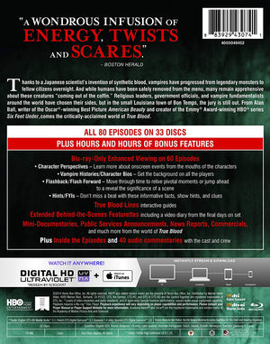 Vampires and other creatures exist in the world, and with the invention of synthetic blood they are making their presence known. 'True Blood,' the HBO series based on the popular books by Charlaine Harris, follows a young waitress named Sookie Stackhouse, who lives in the town of Bon Temps, Louisiana. Sookie, who possesses supernatural abilities of her own, meets and falls in love with Bill, a vampire who has returned to the small town. Throughout the series, the couple and the town face numerous challenges from humans, evil vampires, shape shifters, and more. In addition to Sookie and Bill, the story also follows regulars Tara, Jason, Sam, LaFayette, and Eric. This 2014 Blu-ray box set of the award-winning series includes 33 discs and a digital copy for your enjoyment.